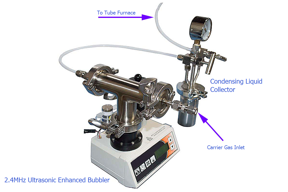AC 220V,2.4MHz超聲機(jī)。 液體罐上涂有氟化物,并采用氟膠密封圈密封。 可設(shè)置超聲儀功率0-100%,每次按5%增加。 316不銹鋼三通,帶有1/4英寸轉(zhuǎn)換接頭,用于通入載流氣體。
