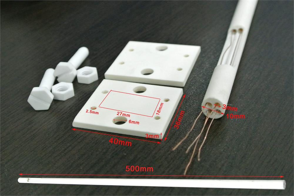 配備一四孔陶瓷支撐管,允許電線通過并測(cè)試樣品連接。 上下壓板保證電線與樣品之前適當(dāng)?shù)慕饘俳佑|。 利用陶瓷螺栓母實(shí)現(xiàn)上下陶瓷壓板的緊密壓實(shí)。 |