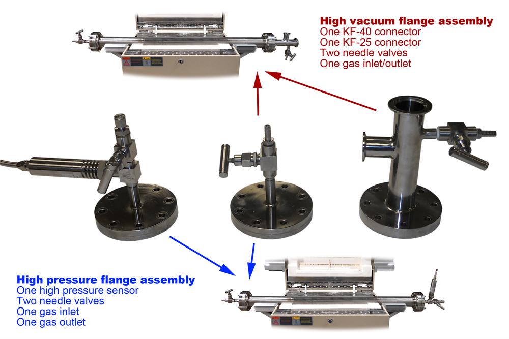 爐管兩端焊接有兩個CF法蘭,采用無氧銅密封圈密封; 出氣端接口為KF40接口(用于連接分子泵); 法蘭采用無氧銅密封圈密封,您可以訂購額外的銅墊片; 可是用扭矩扳手,以避免過度緊固法蘭。